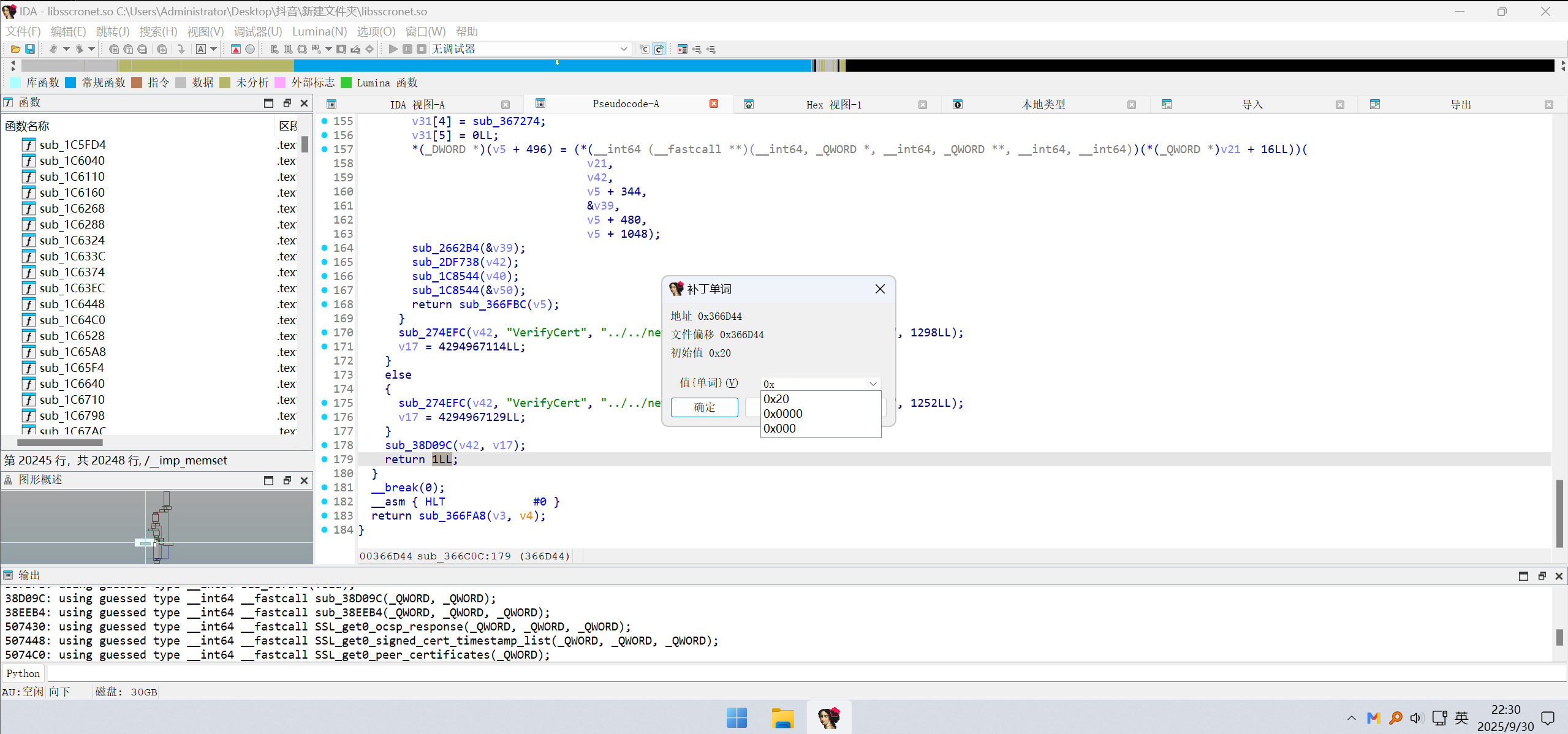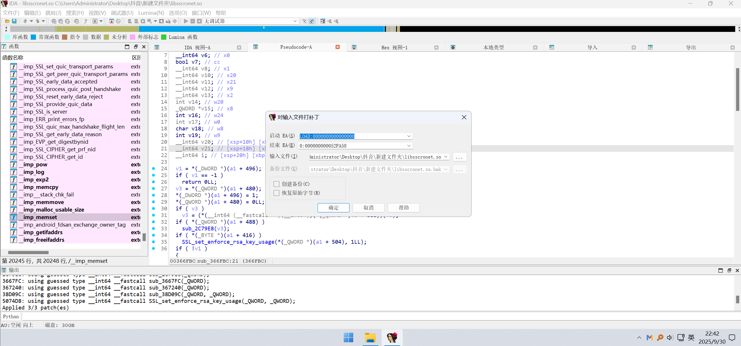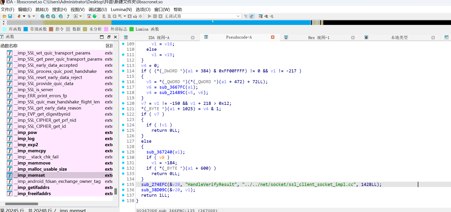 把这个软件提取出来,使用IDA Pro(反编译工具) 对libsscronet.so软件进行反编译