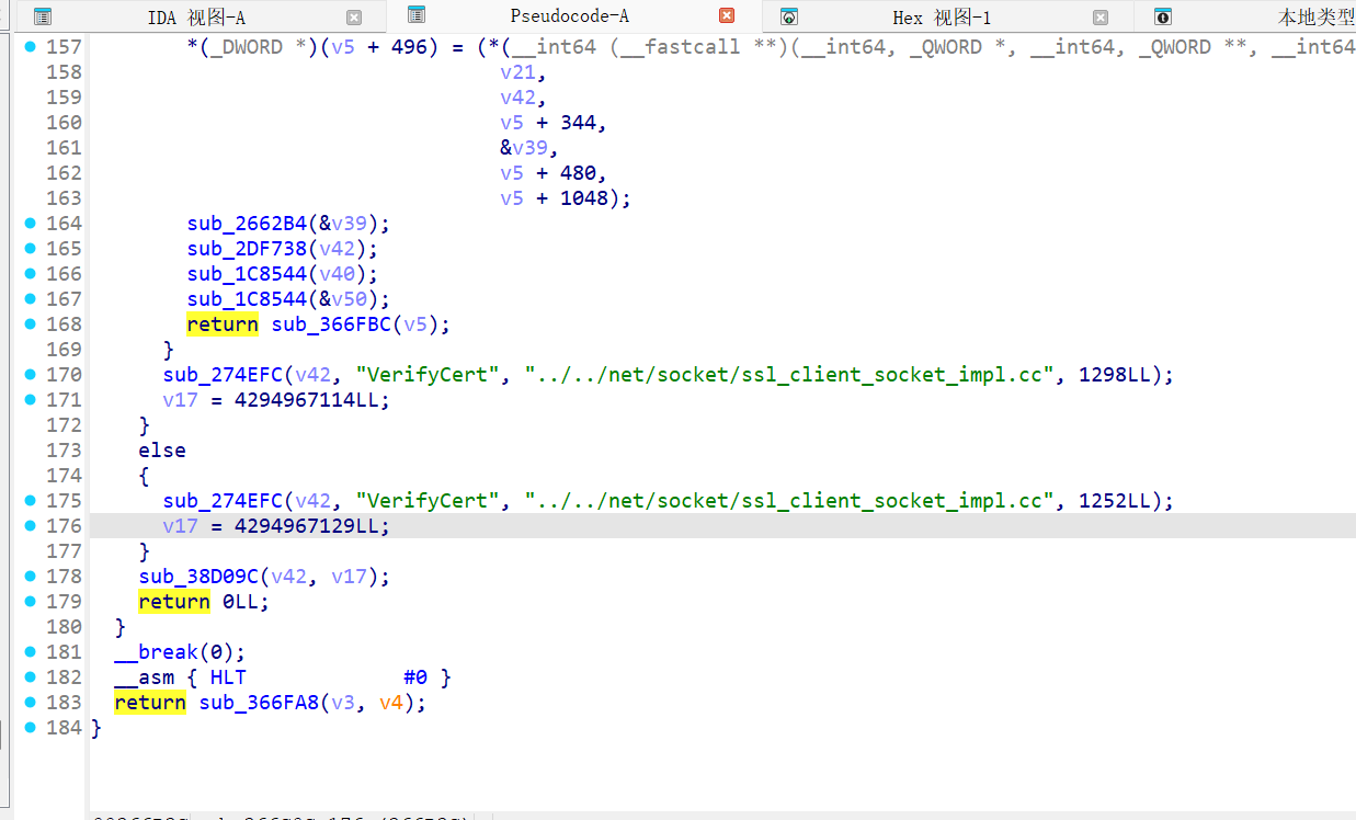 还没结束,可以从上图看到它还返回了几个函数,但是得点击这几个返回的函数发现他们都是指向另一个函数的;return sub_XXXXXX ,一随机双击sub_XXXXXX一个函数,就可以跳转到,如下图